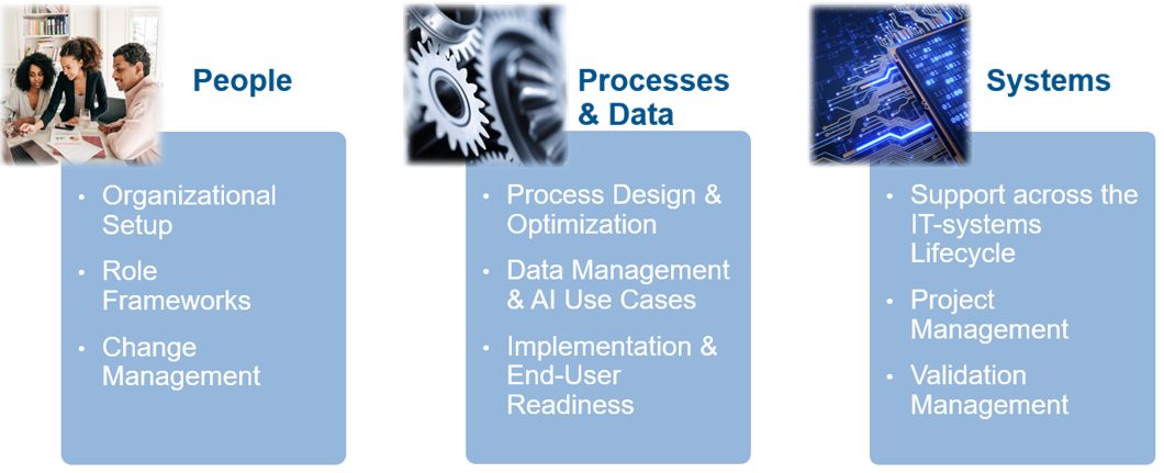 We combine deep process understanding with IT and organizational expertise to deliver compliant, efficient, and sustainable digital solutions in highly regulated environments.